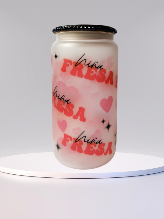 16 oz Glass Cup with Bejeweled Lid - Niña Fresa (Includes Straw and Cleaner)