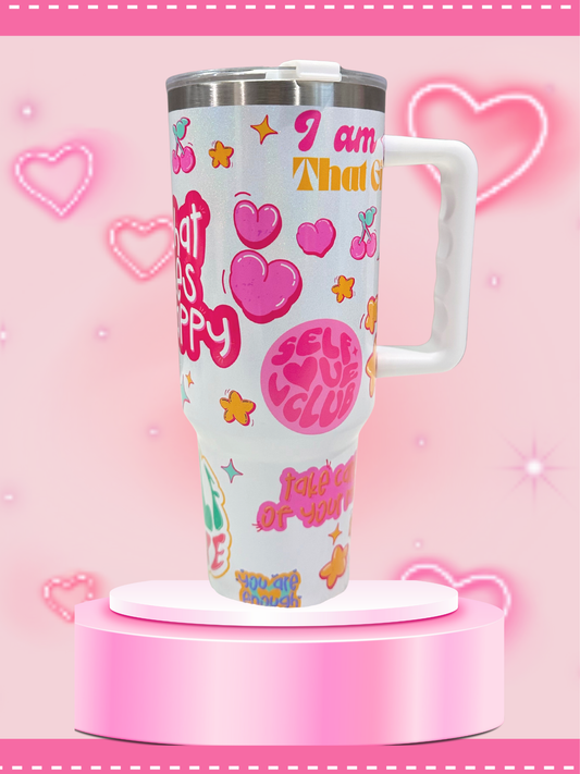 Self Love Club Pink Stainless Steel Tumbler with Handle Includes Straw and Cleaner)