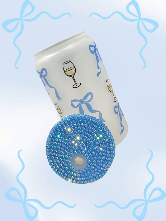 16 oz Glass Cup with Bejeweled Lid -Blue Coquette Wine Glass (Includes Straw and Cleaner)