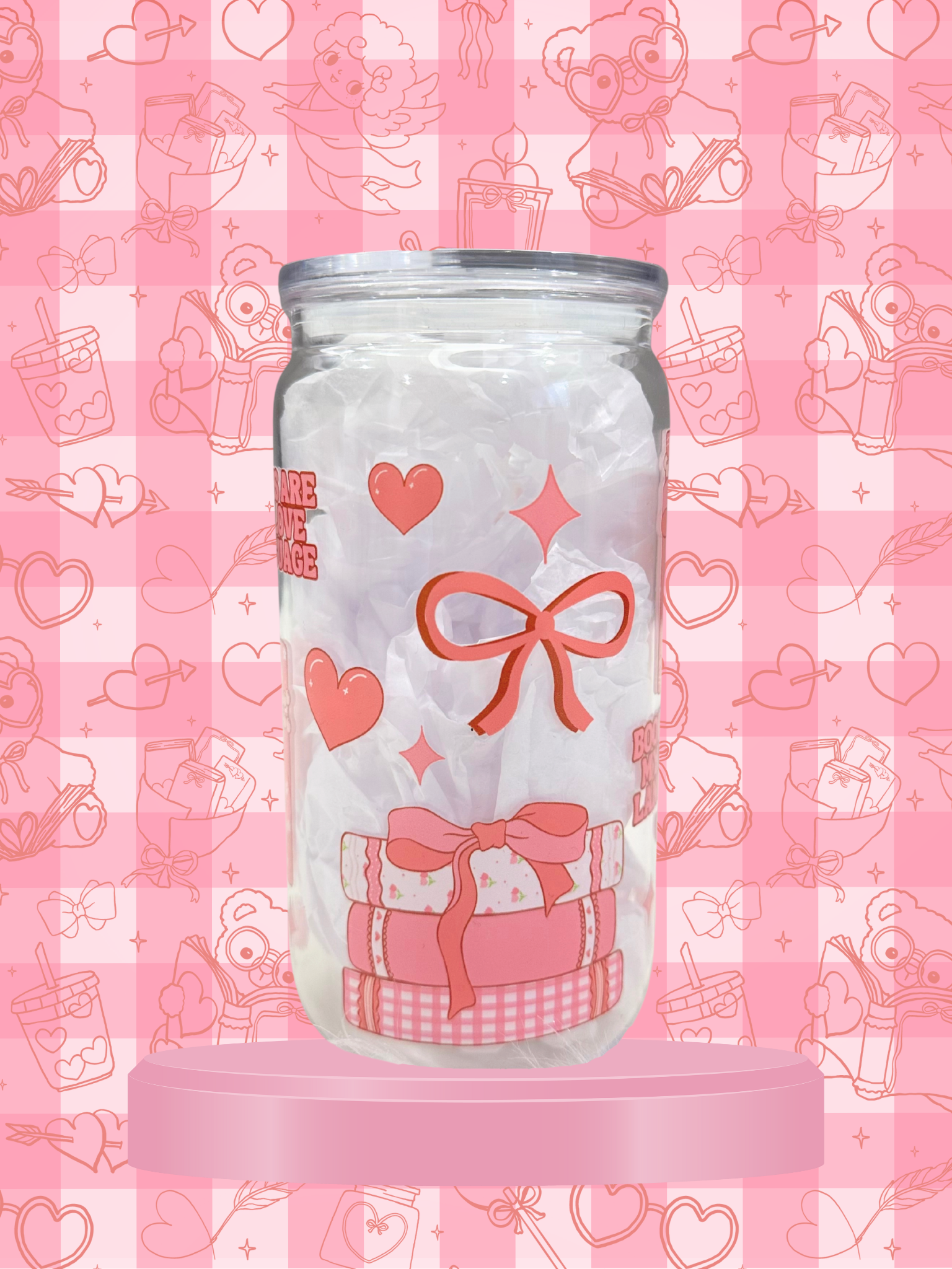 Fall in love with every sip using this adorable “Books & Bows” plastic tumbler, designed especially for book lovers, readers, and romance novel fans. Featuring a soft pink aesthetic with stacked books, bows, hearts, and cozy reading vibes, this glass is perfect for iced coffee, tea, matcha, or your favorite cold drinks.
